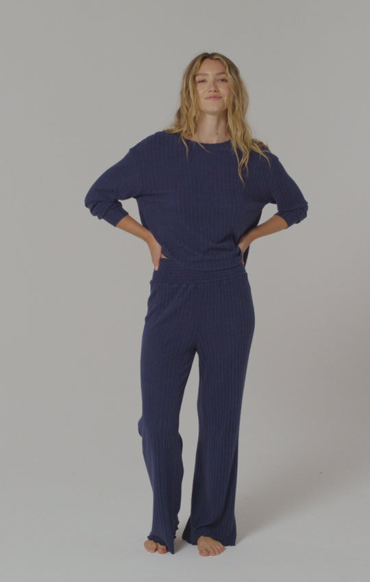 Crafted in silky rib knit, this long sleeve top delivers a smooth, body-skimming fit. Designed for easy layering, it pairs perfectly with matching bottoms or your favorite lounge pants.